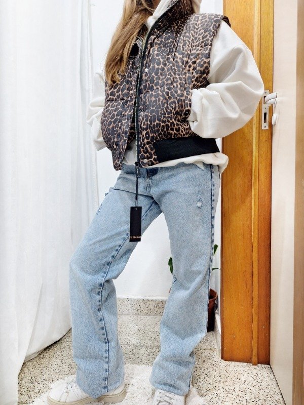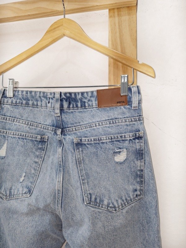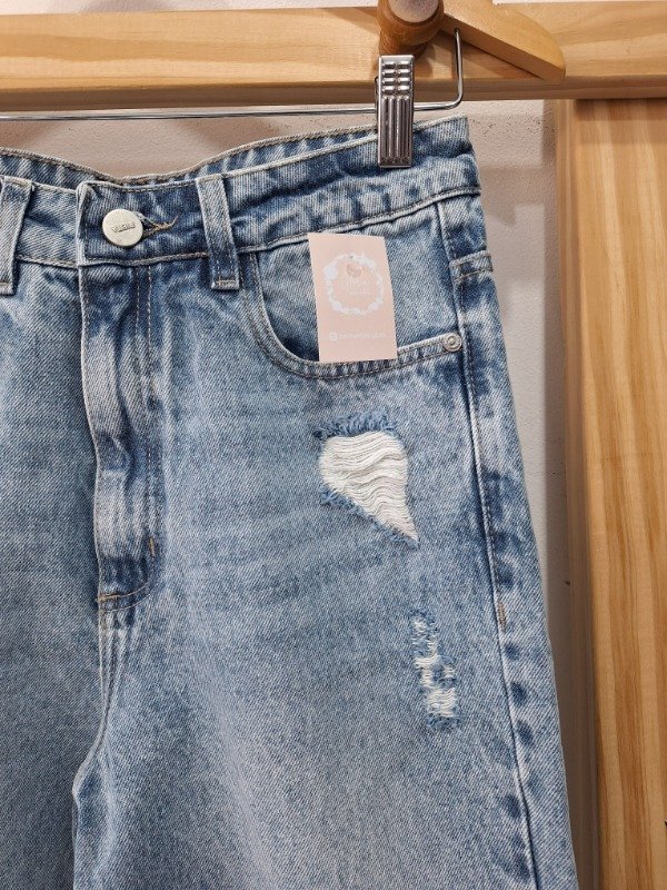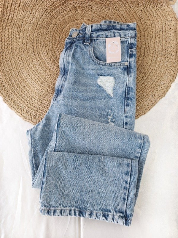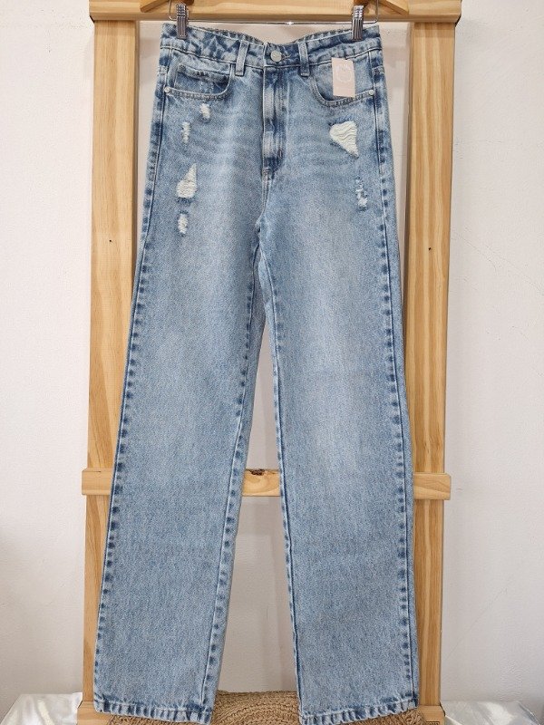 Jean tiro alto rígido, corte recto con pequeñas roturas calce perfecto.