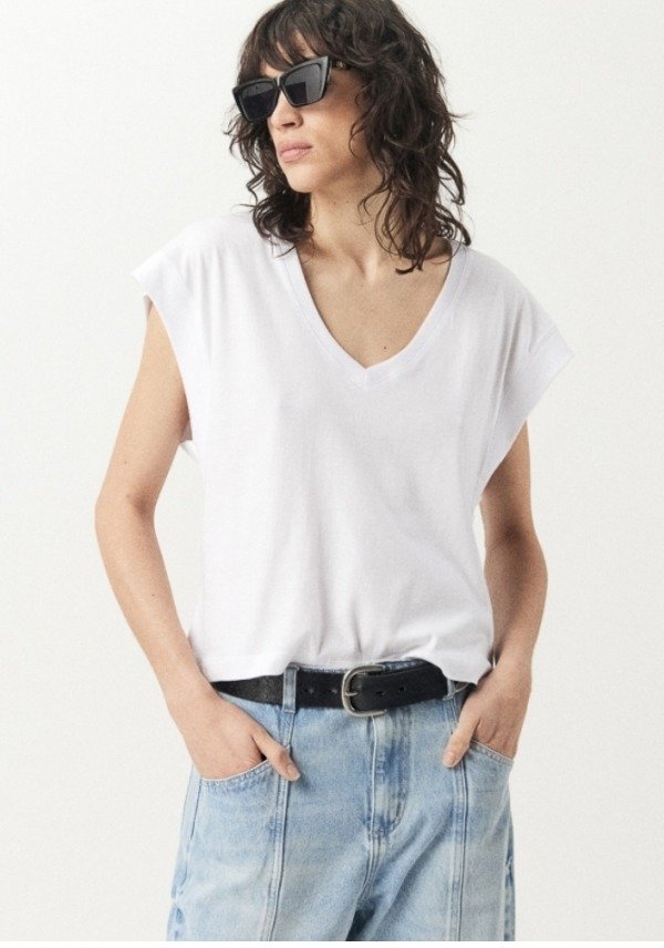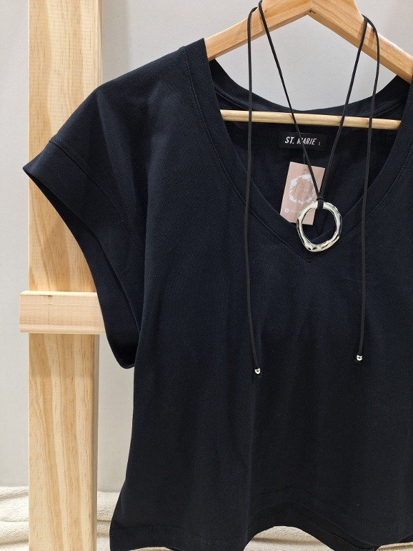 REMERA DE ALGODÓN ESCOTE V CON DIJE EN LA ESPALDA